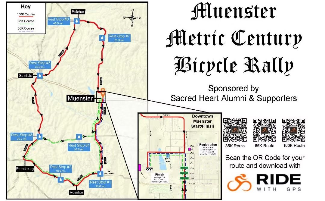The Muenster Metric Century Bicycle Rally offers three distinct route options on paved roads to accommodate various fitness levels: