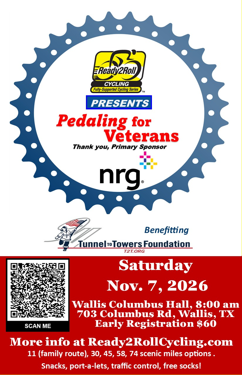 Pedaling for the Veterans is an inspiring cycling event now entering its third year of operation. Located just west of Houston in Wallis, Texas, this ride is dedicated to supporting the families of our nation’s veterans and first responders. The primary beneficiary of the event is the Tunnel to Towers Foundation (T2T), an organization founded after the events of September 11, 2001, to provide mortgage-free homes to Gold Star and fallen first responder families with young children.